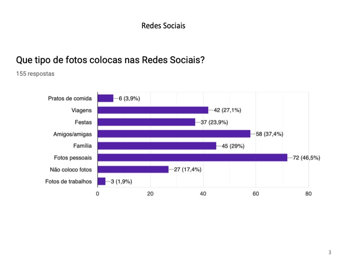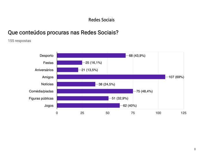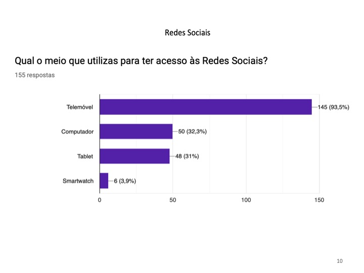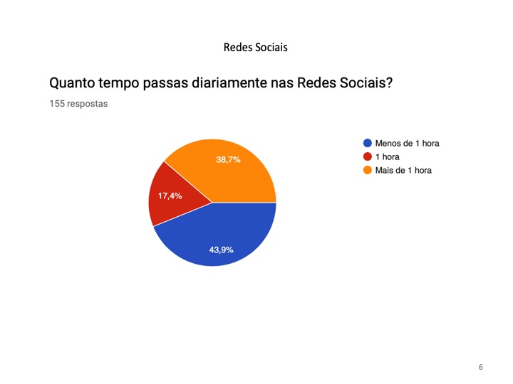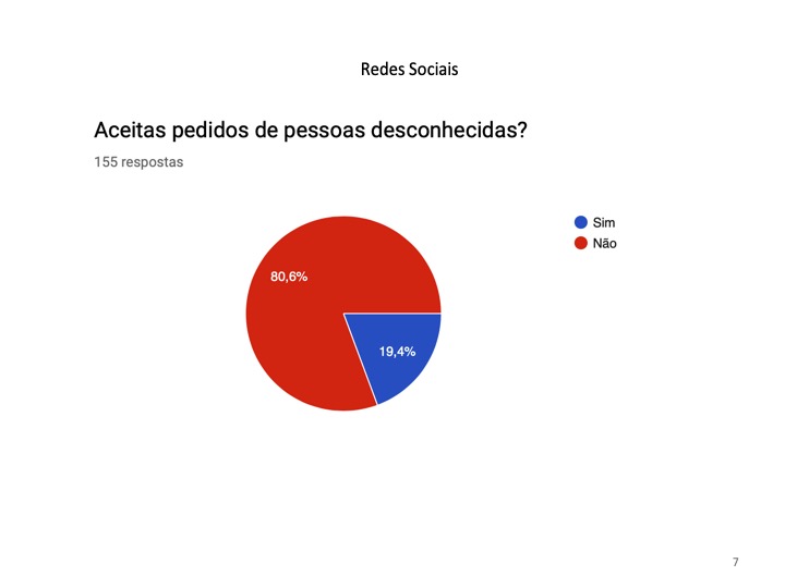 Relativamente às redes sociais, os alunos foram inquiridos sobre as redes sociais preferidas, os conteúdos partilhados, o tempo dispendido e os possíveis perigos da sua utilização abusiva. O grupo de trabalho verificou que o Instagram e o Messenger são as redes sociais mais utilizadas pelos jovens. Quanto ao conteúdo partilhado, predomina a postagem de fotos pessoais. Constatou-se ainda que cerca de 93,5% dos alunos nunca foram prejudicados por essas publicações, no entanto, uma pequena percentagem que corresponde a 6,5% já o foram. Além disso, esses perigos devem-se à aceitação de pedidos de amizade de pessoas desconhecidas para 19.4% das pessoas inquiridas. Concluiu-se que esta faixa etária dispende entre uma a duas horas do seu tempo diário na Internet, com o objetivo de procurar conteúdos acerca dos amigos e, essencialmente, para “passar tempo” nas redes sociais.