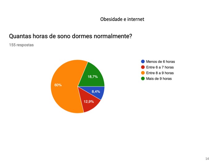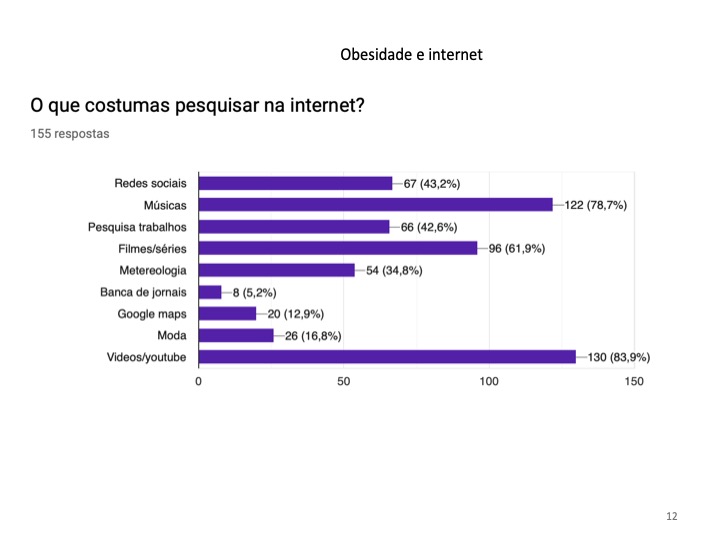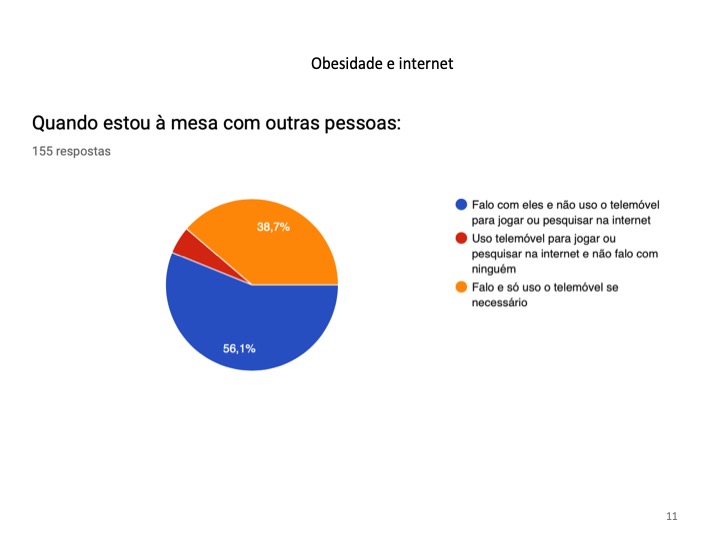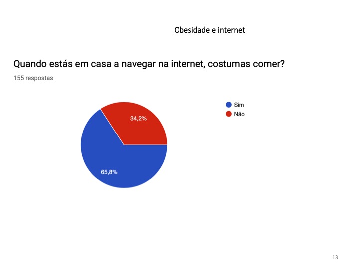 No inquérito, foram ainda abordadas questões relacionadas com a obesidade nos jovens devido ao uso excessivo da Internet. Não foi encontrada uma relação direta entre o excesso de peso e a utilização da Internet, no entanto, 65.8% referiram que costumam comer enquanto navegam.