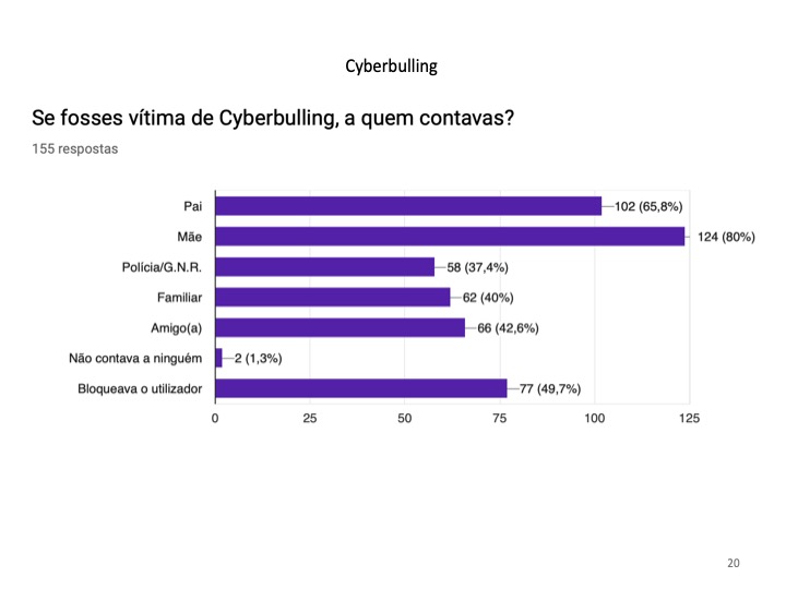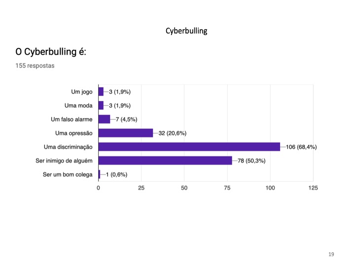 Ainda relacionado com os perigos da Internet, 68.4% dos alunos associaram o cyberbullying a uma discriminação, mostrando saber o significado da palavra, afirmando ainda que, caso fossem vítimas dessa situação, confidenciavam-na à mãe (80%) ou ao pai (65.8%). Concluindo que a família é uma retaguarda estável para os adolescentes.