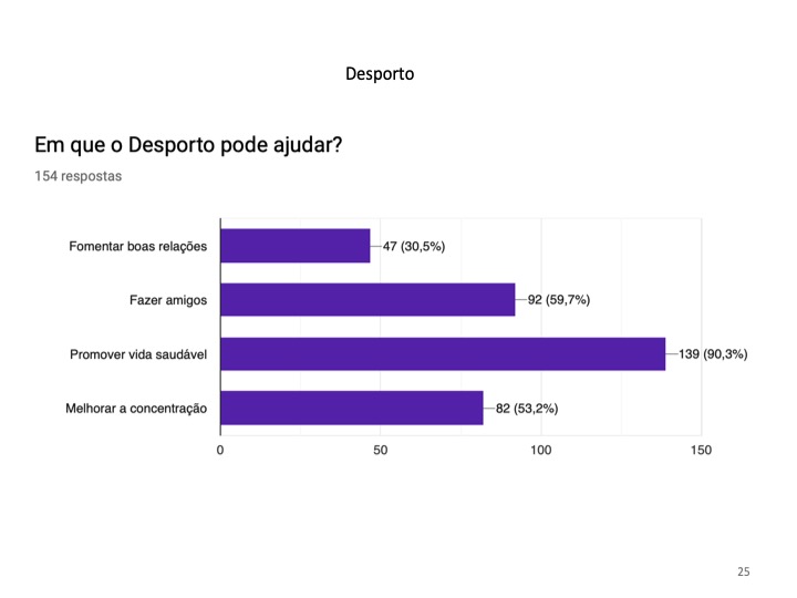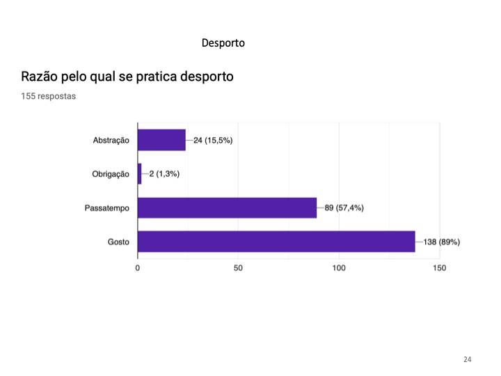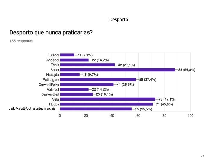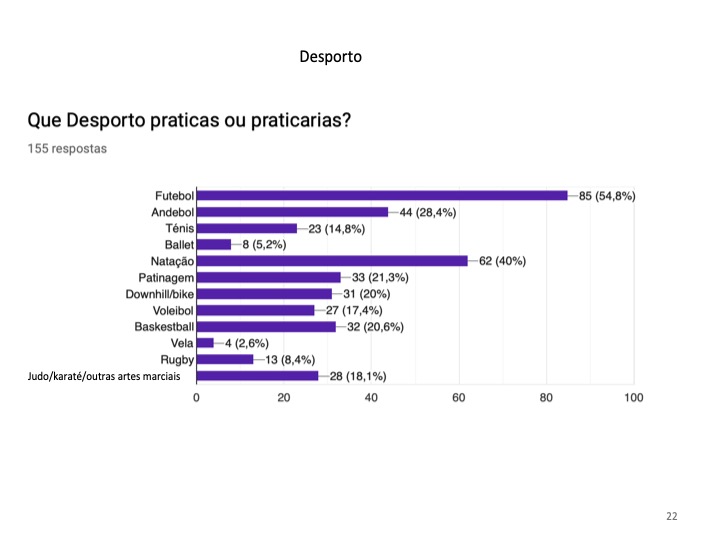 Será que os jovens trocam a prática de desporto pela utilização da Internet? Chegamos à conclusão que somente 16.5% da população inquirida não pratica qualquer desporto. De entre as modalidades mais praticadas destaca-se, sem surpresa, o futebol que domina com 54.8% e o que apresenta menos adeptos é o ballet. Os alunos vêem no desporto um passatempo ou praticam-no por gosto, sendo ainda uma forma de manter uma vida social ativa e saudável.