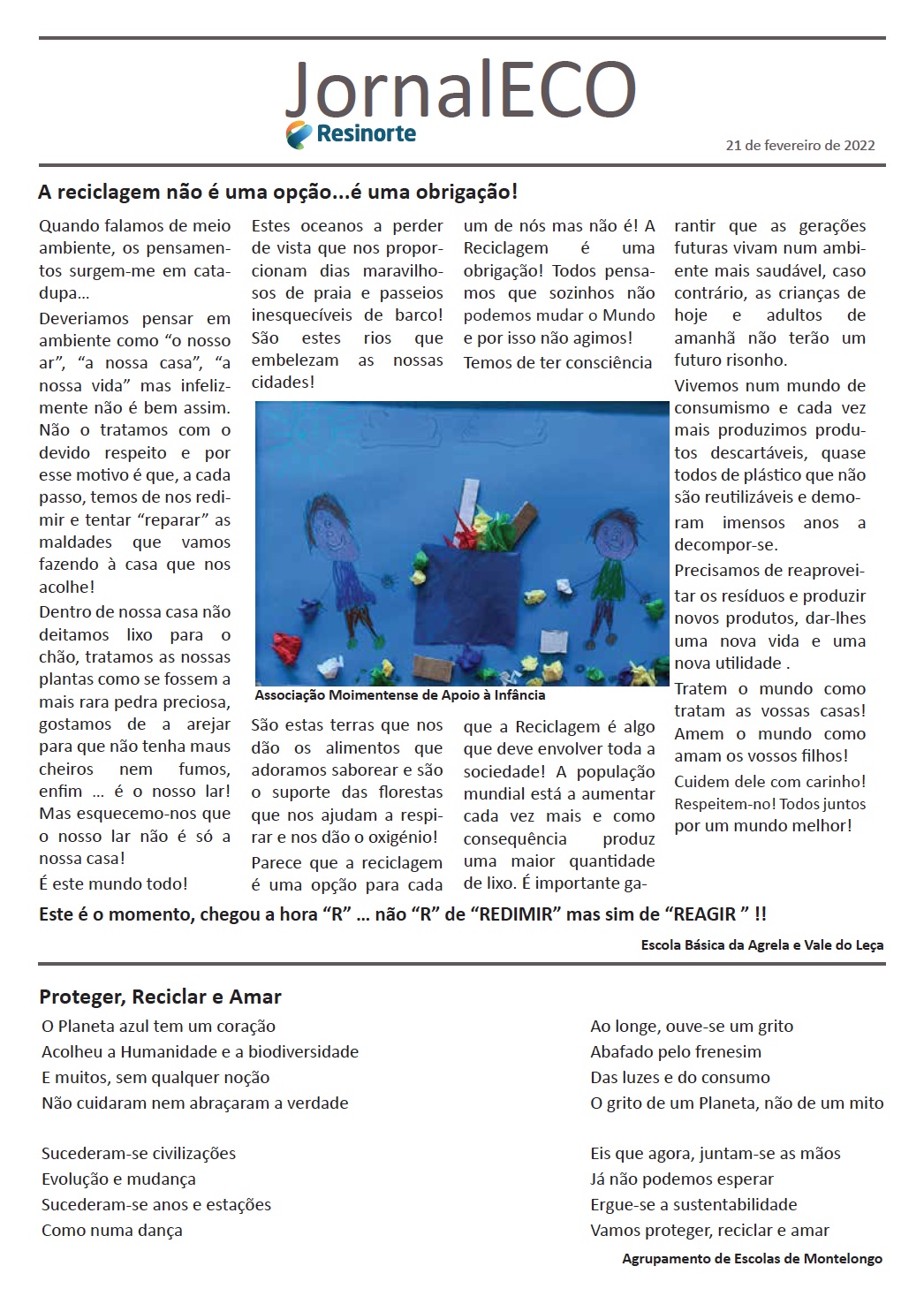 O poema, selecionado pelo Júri da Resinorte, intitula-se «Proteger, Reciclar e Amar» e foi escrito pela aluna, Ana Clara Machado, do 7.º AM.